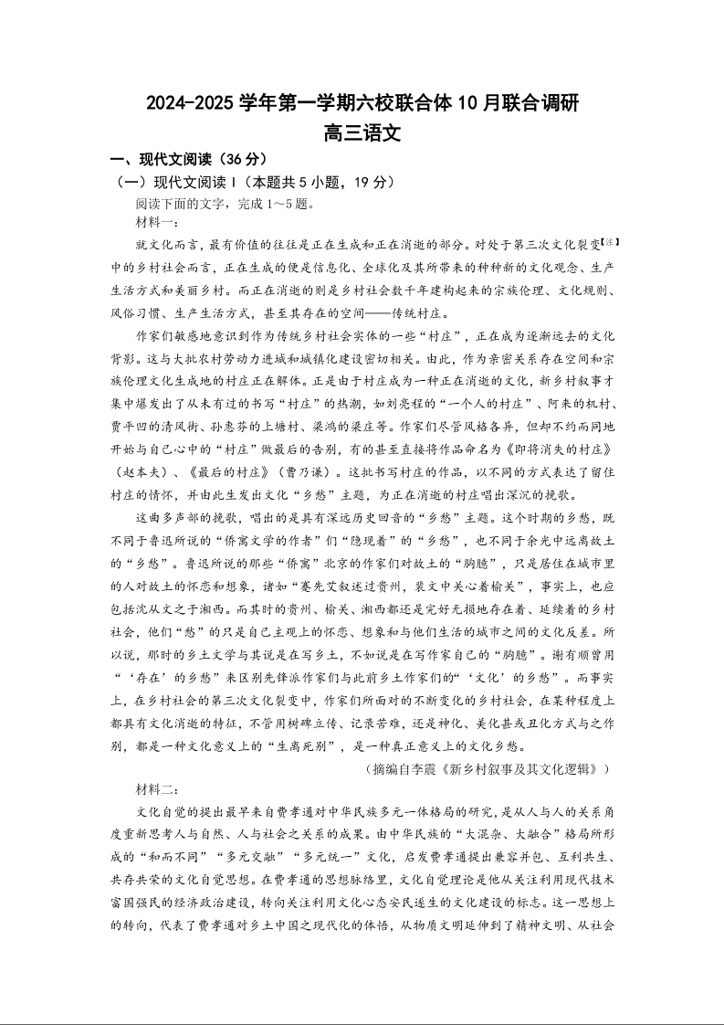 2024-2025学年第一学期六校联合体10月联合调研+语文