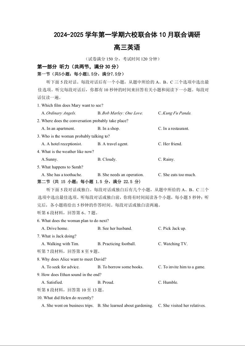 2024-2025学年第一学期六校联合体10月联合调研+英语