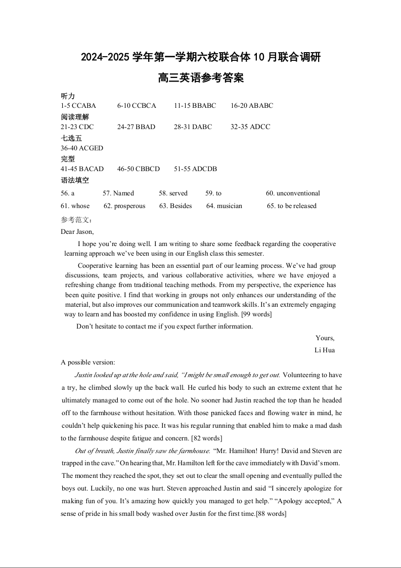 2024-2025学年第一学期六校联合体10月联合调研+英语答案