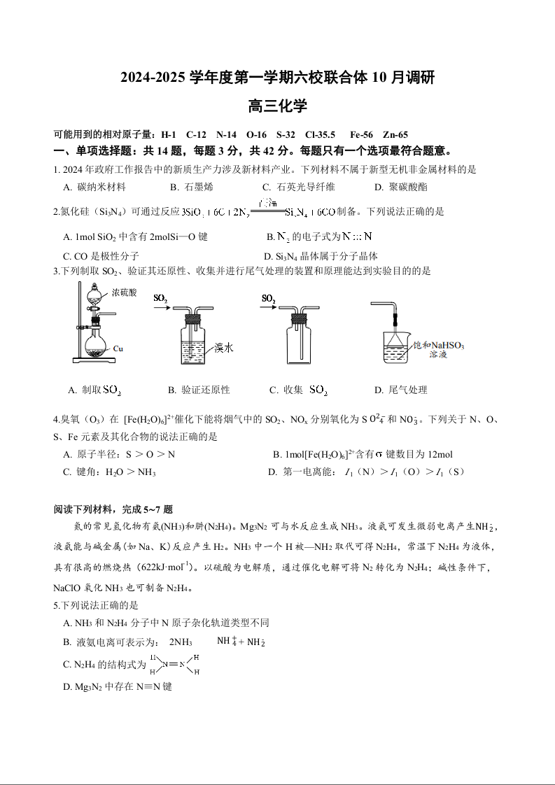 2024-2025学年第一学期六校联合体10月联合调研+化学