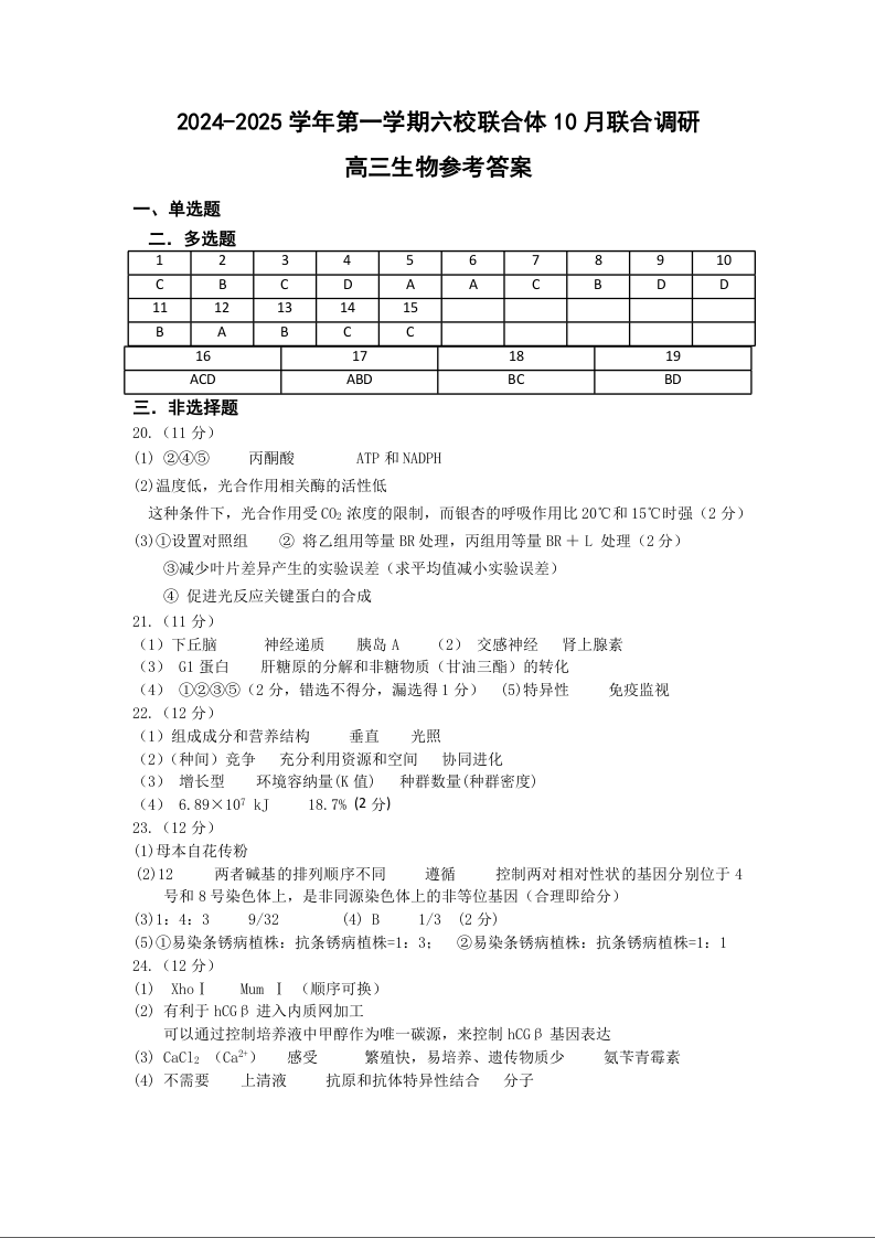 2024-2025学年第一学期六校联合体10月联合调研+生物答案