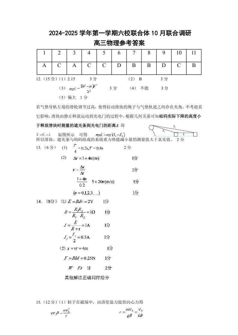 2024-2025学年第一学期六校联合体10月联合调研+物理答案