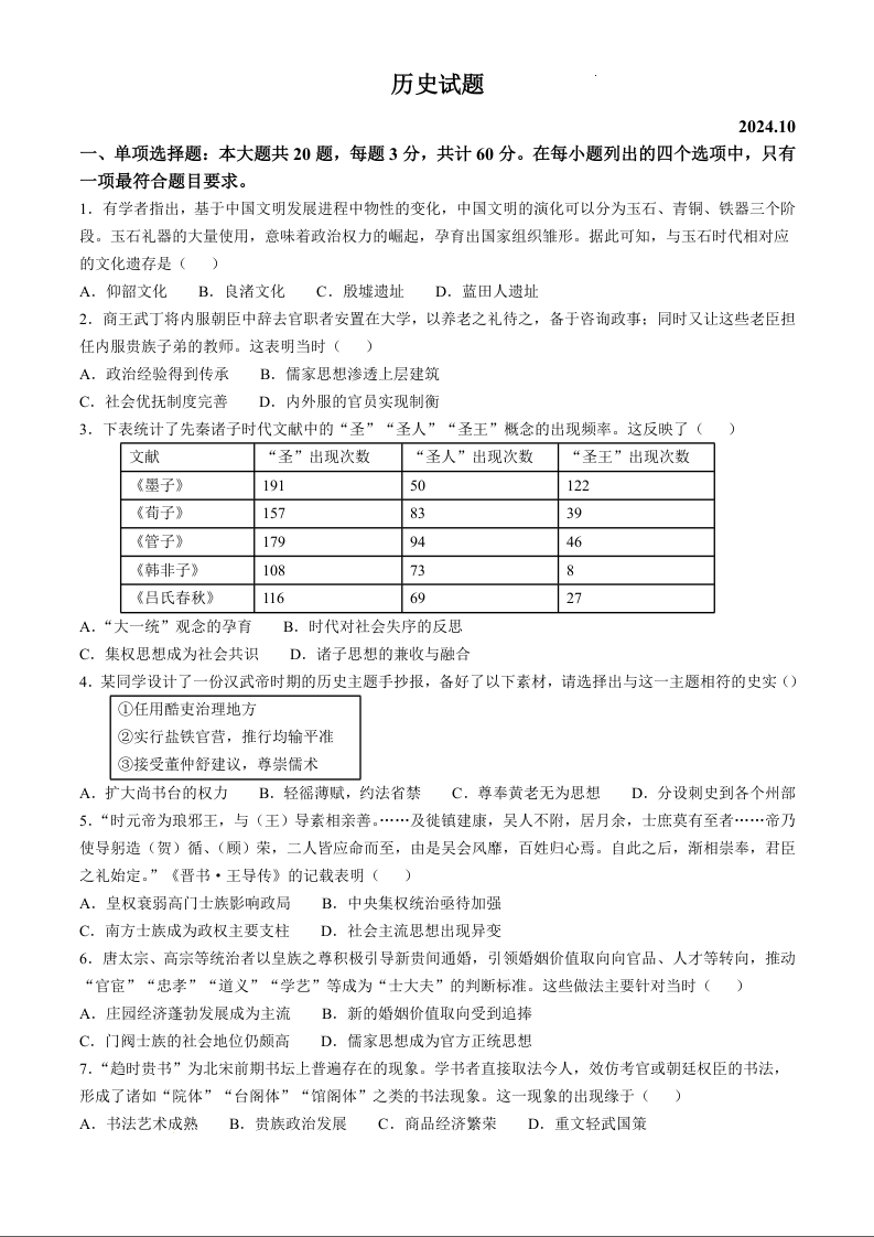 江苏省海安高级中学2025届高三上学期10月月考+历史