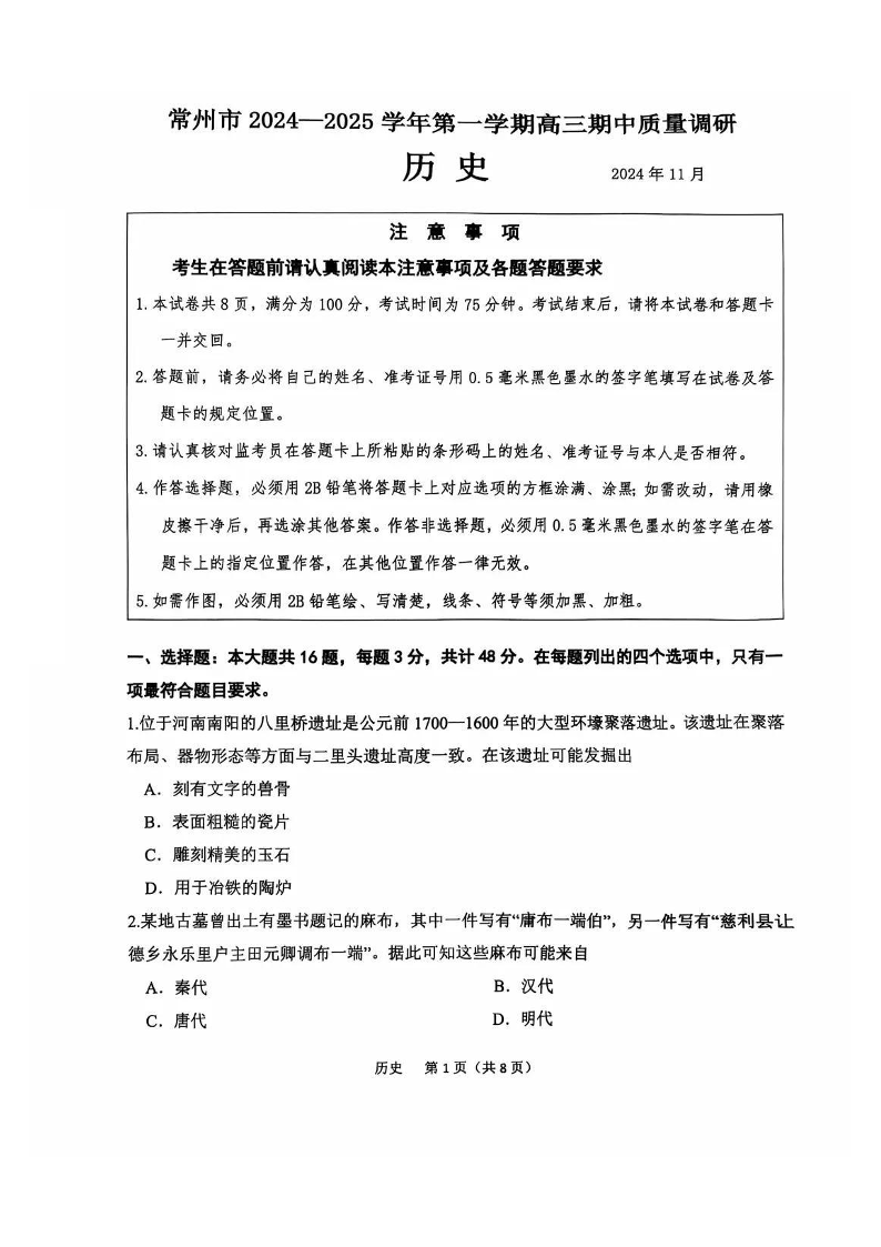 江苏省常州市2024-2025学年高三上学期期中考试+历史