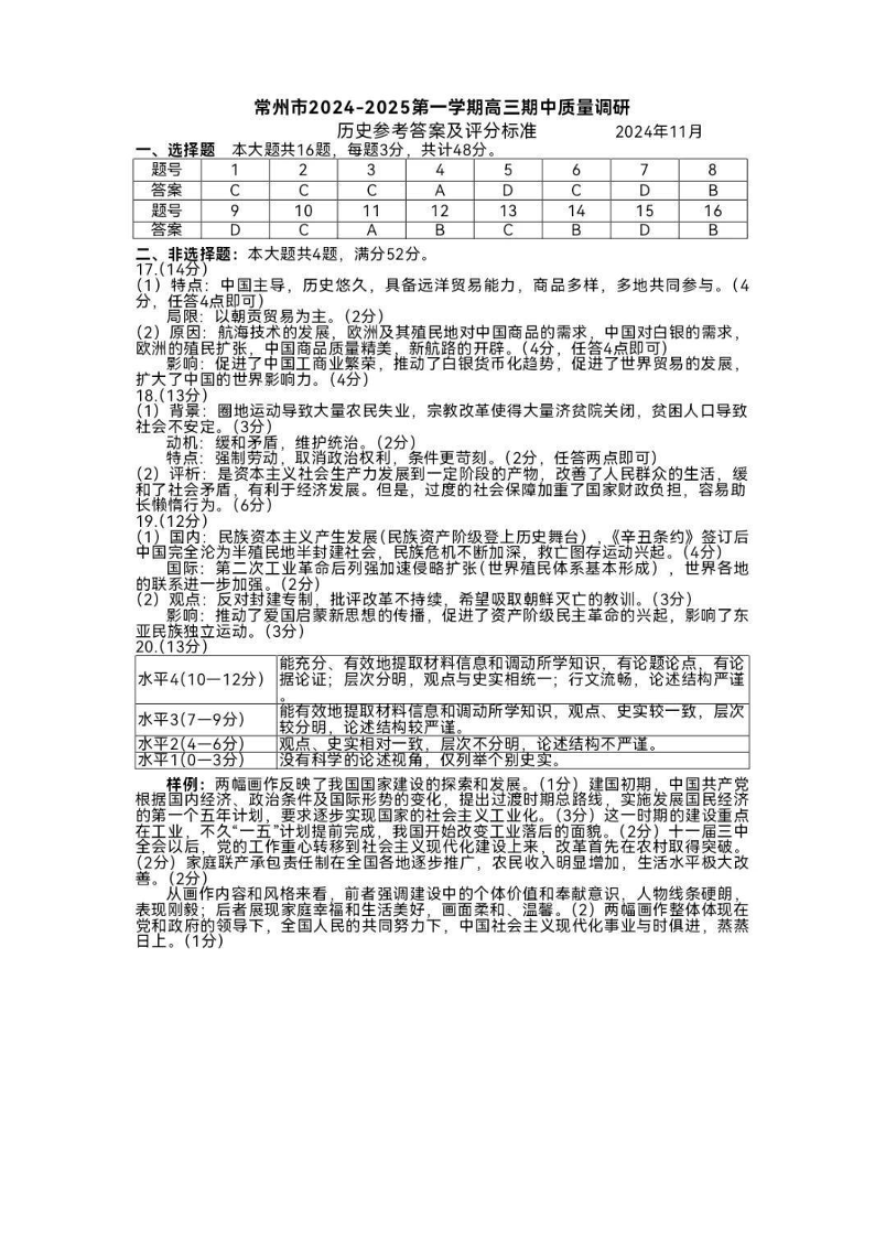 江苏省常州市2024-2025学年高三上学期期中考试+历史答案