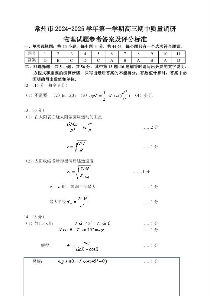 江苏省常州市2024-2025学年高三上学期期中考试+物理答案