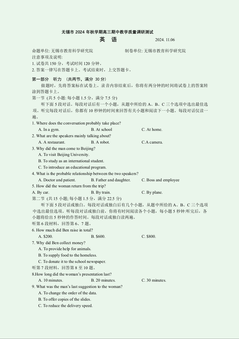 江苏省无锡市2025届高三11月期中教学质量调研测试+英语