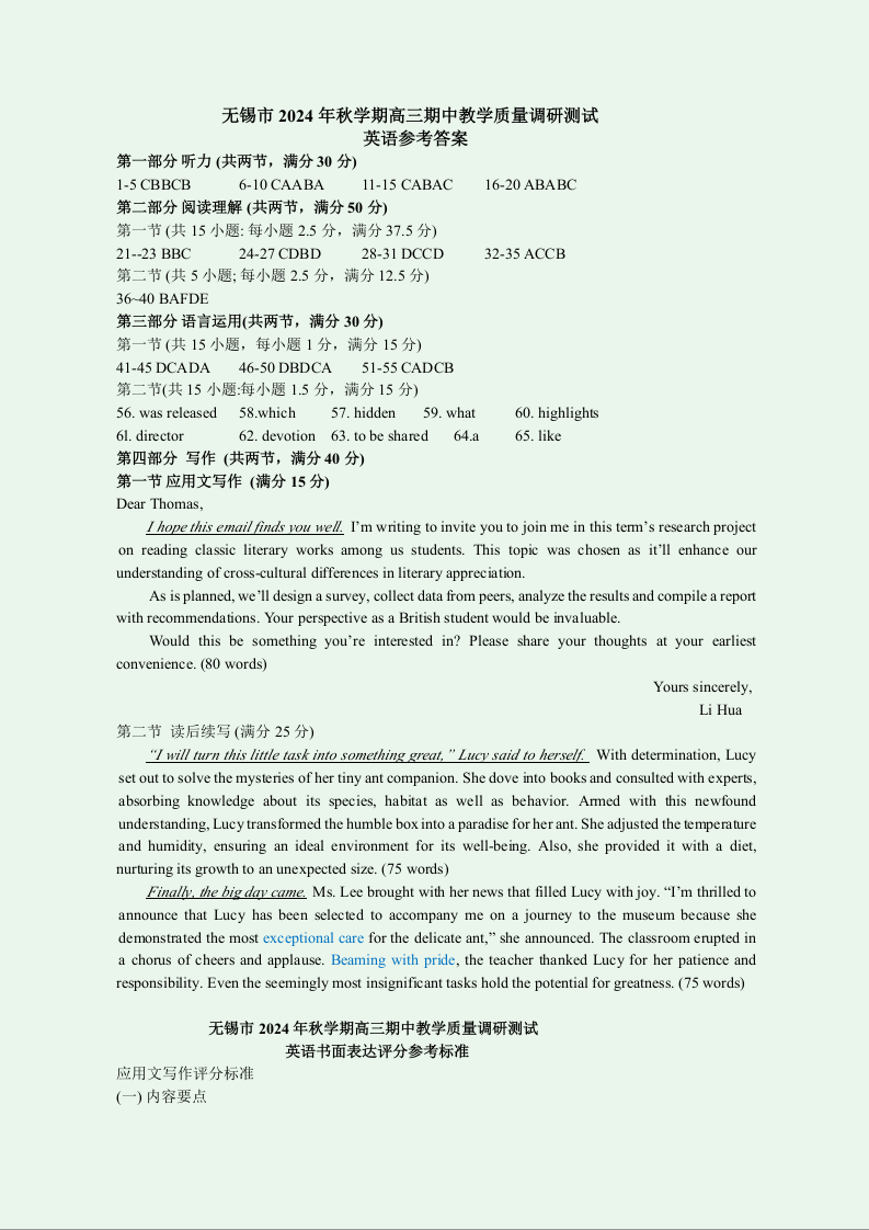 江苏省无锡市2025届高三11月期中教学质量调研测试+英语答案