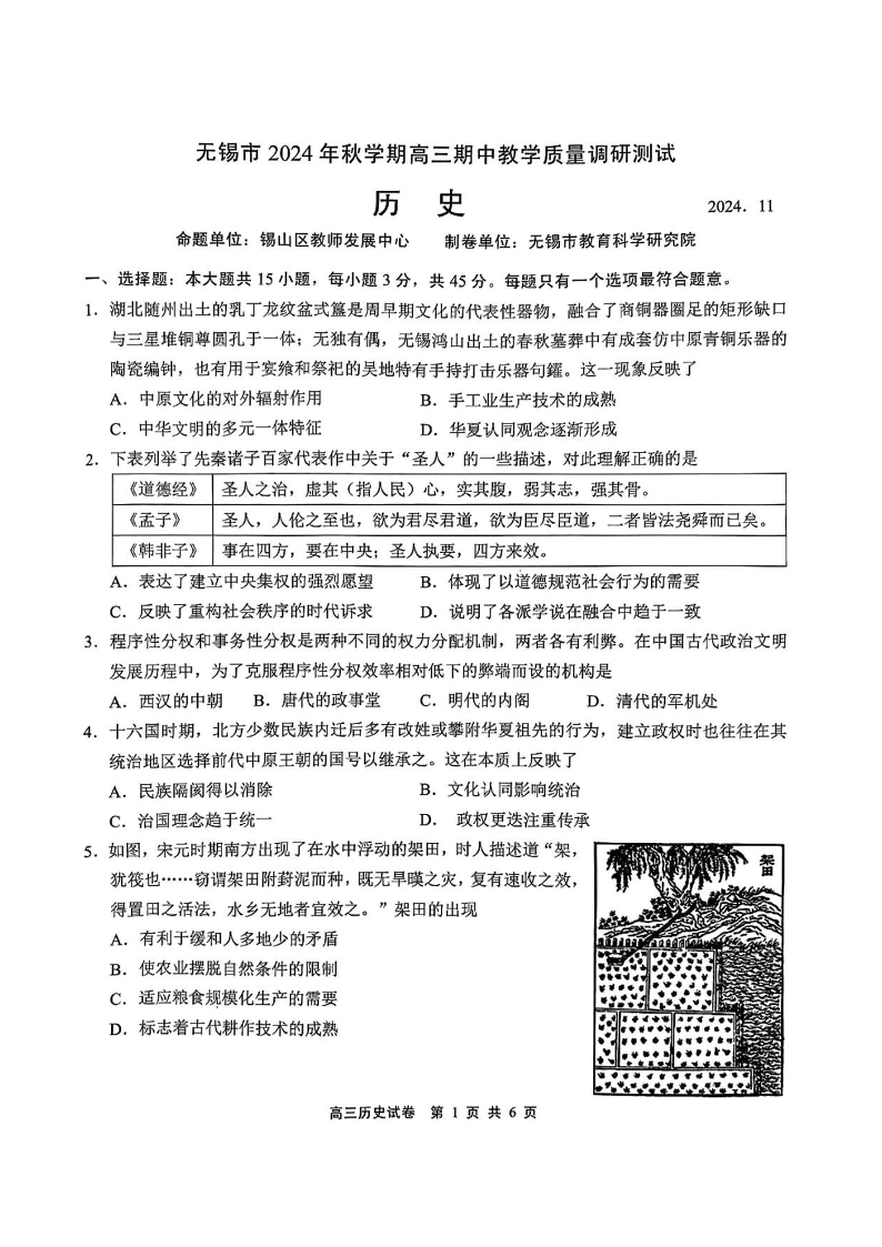 江苏省无锡市2025届高三11月期中教学质量调研测试+历史
