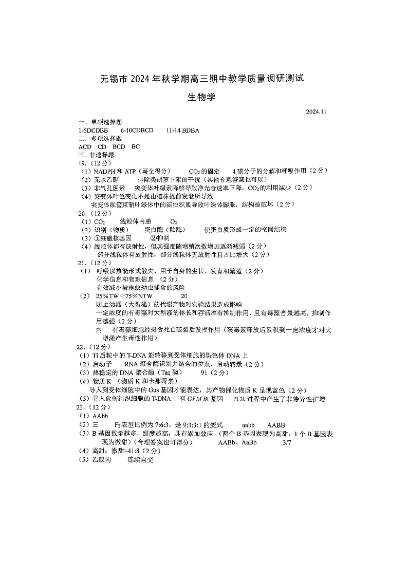 江苏省无锡市2025届高三11月期中教学质量调研测试+生物答案