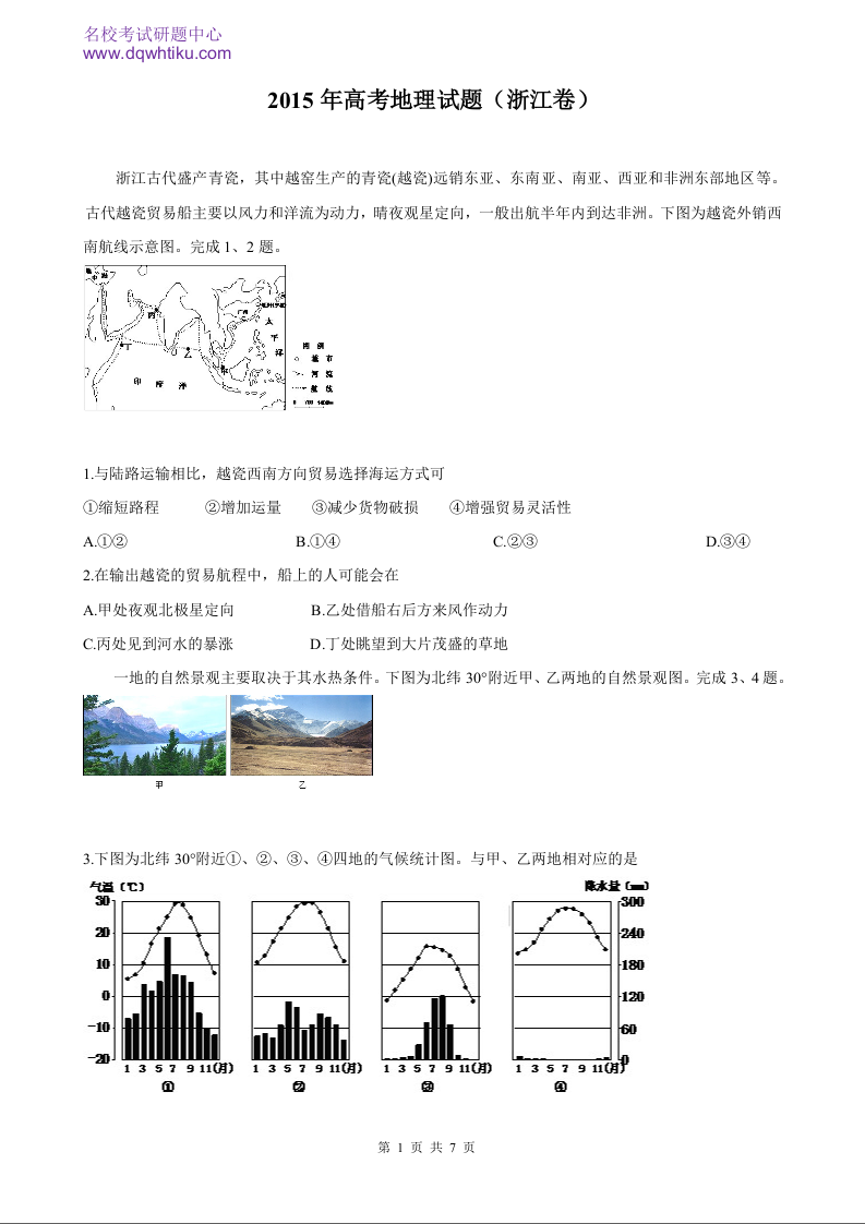2015年地理高考真题--浙江卷