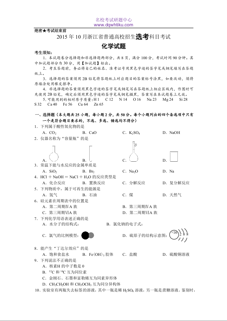 2015年10月浙江省高中化学学考选考试题与答案