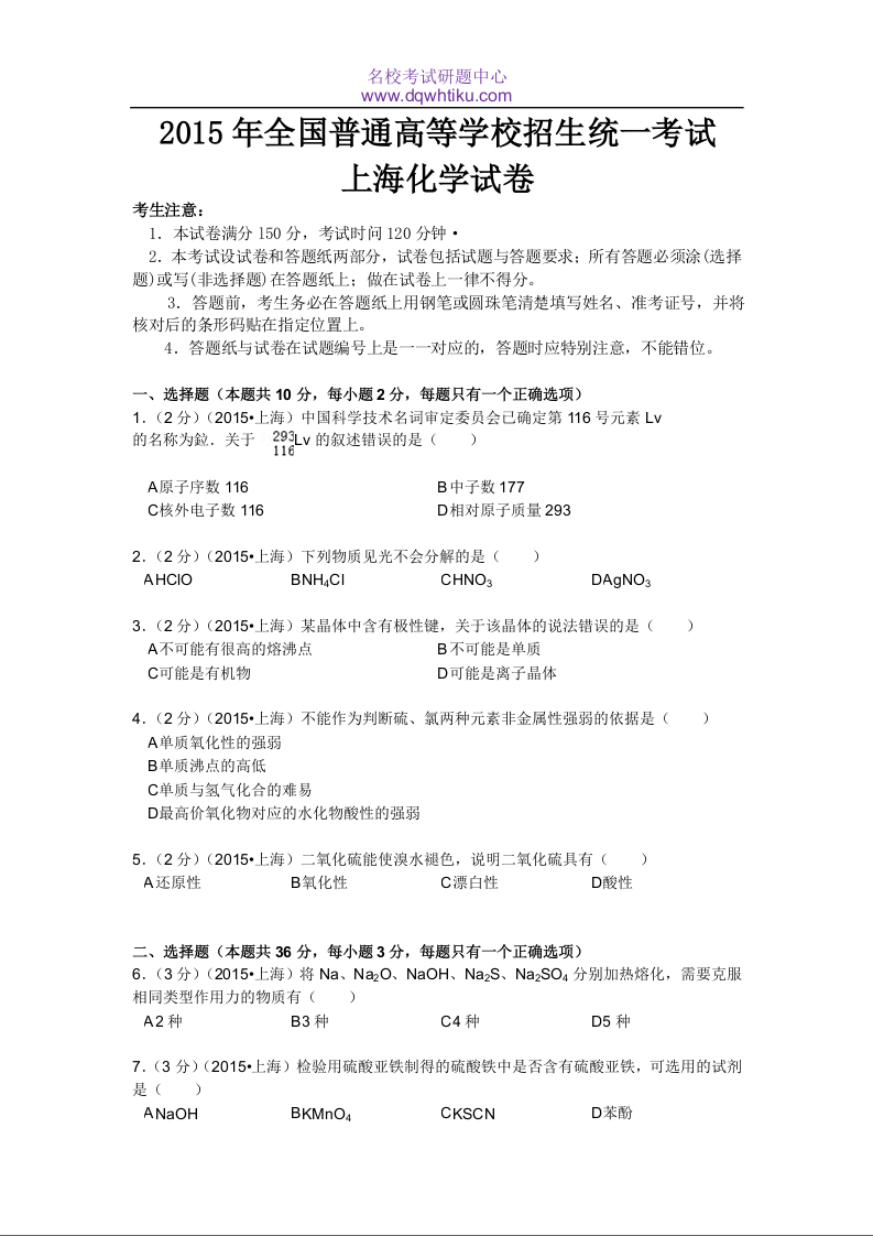 2015年上海市高中毕业统一学业考试化学试卷(word解析版)