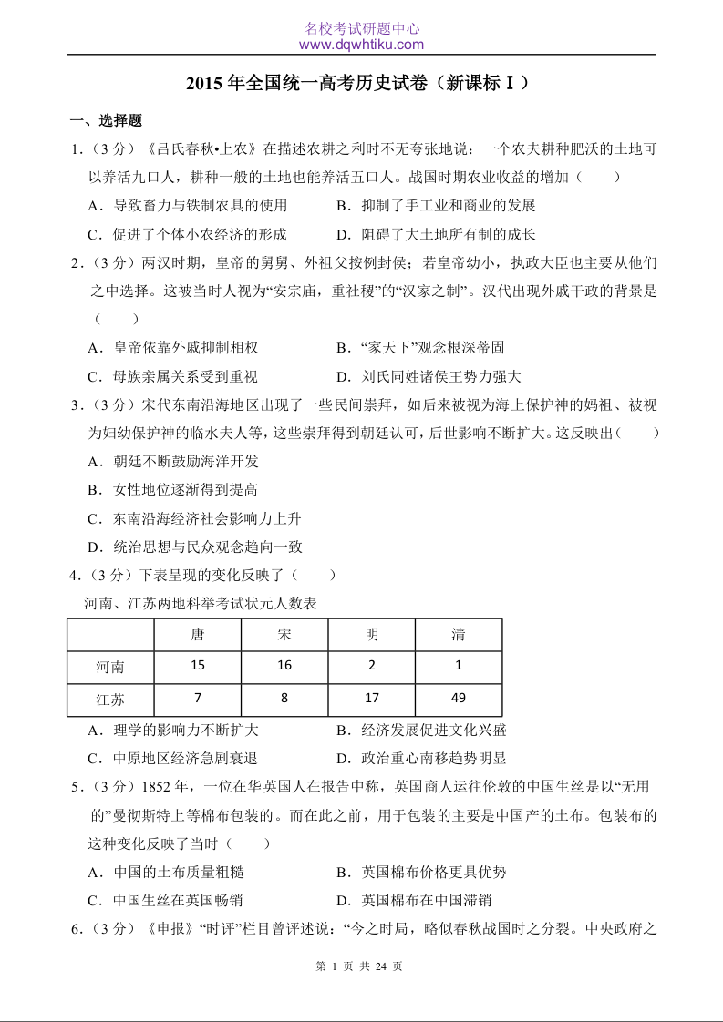 2015年历史高考真题--新课标Ⅰ卷
