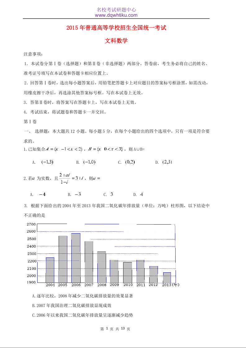 2015年海南省高考文科数学试题及答案