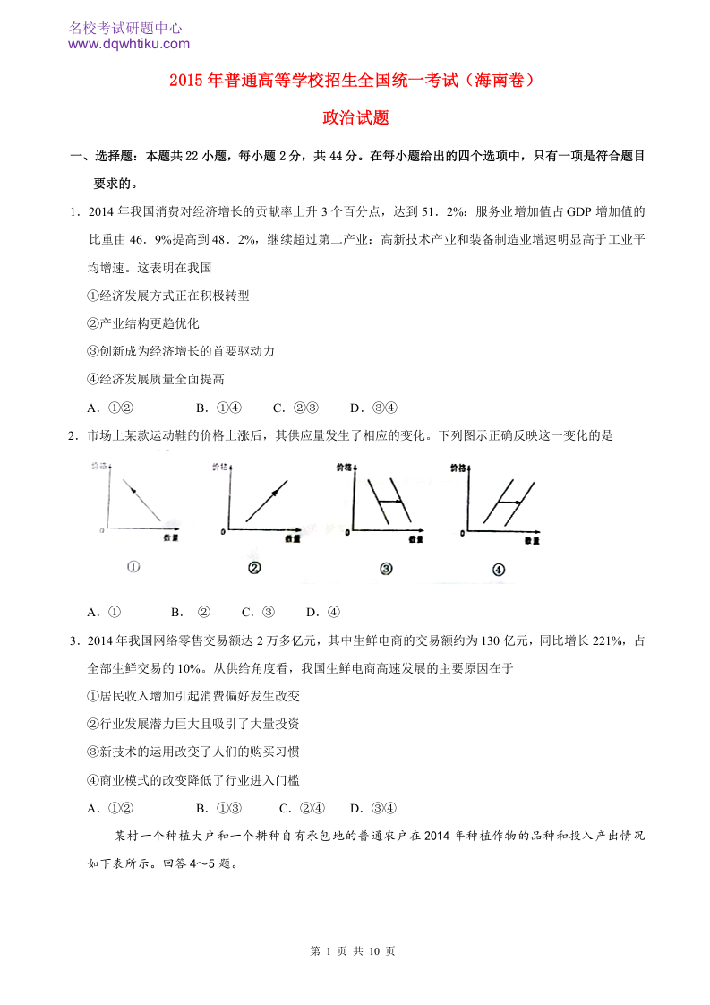2015年政治高考真题--海南卷