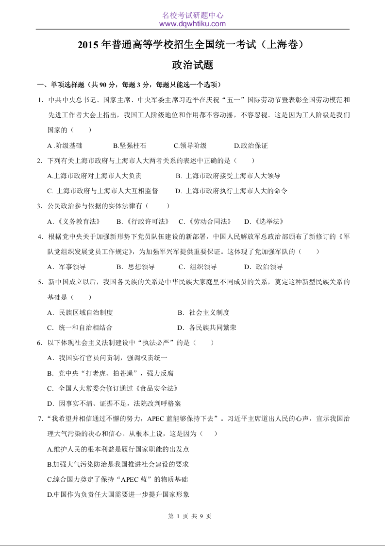 2015年政治高考真题--上海卷