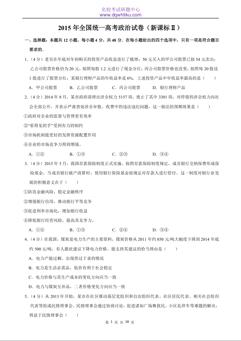 2015年政治高考真题--新课标Ⅱ卷