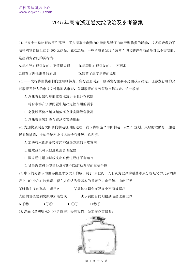 2015年政治高考真题--浙江卷