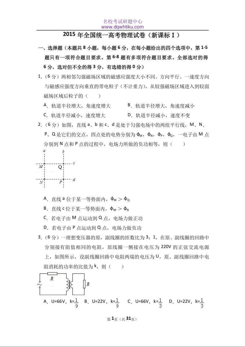 2015年全国统一高考物理试卷(新课标ⅰ)(含解析版)