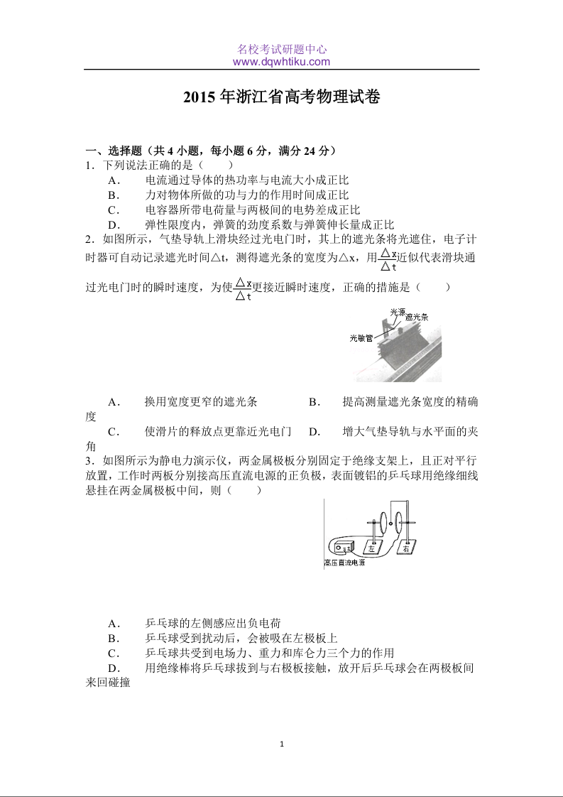 2015浙江高考理综物理试题及答案(word清晰版)