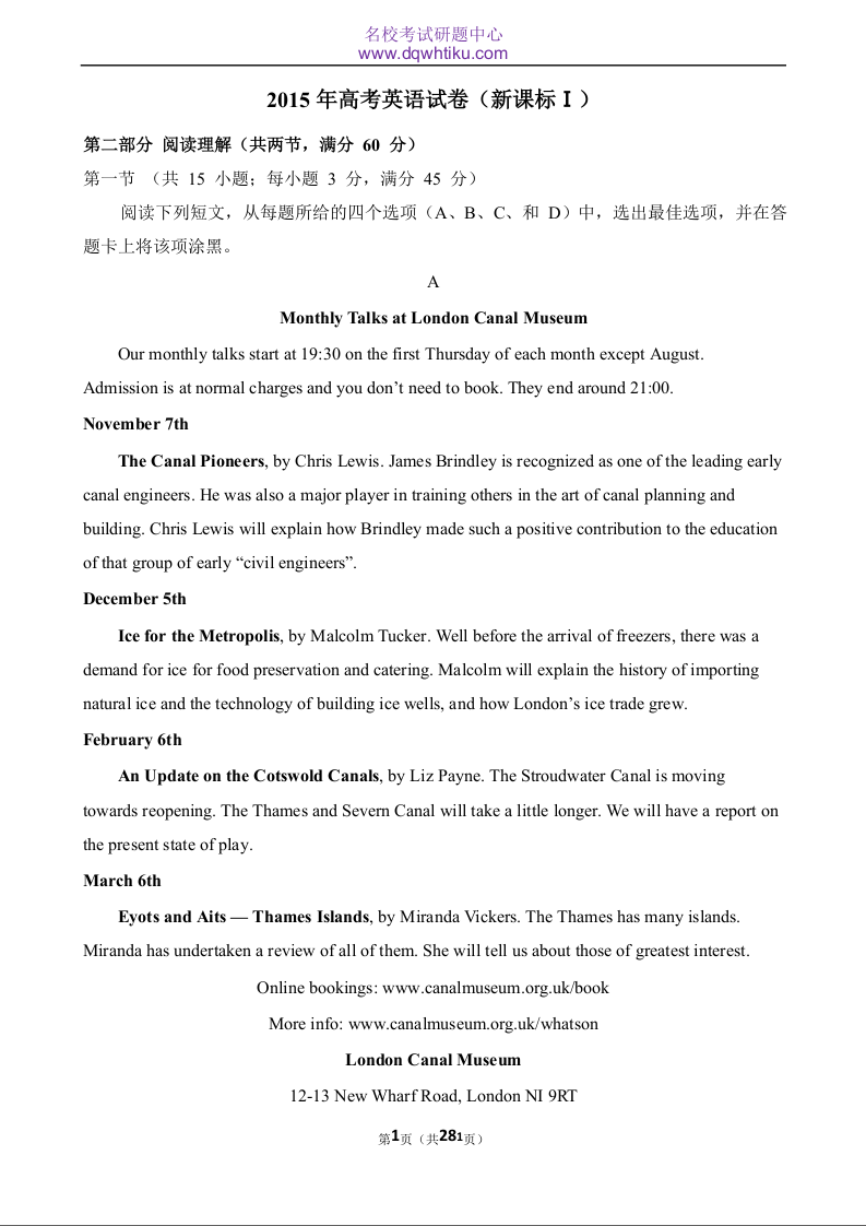 2015年高考英语试卷(新课标Ⅰ)试题