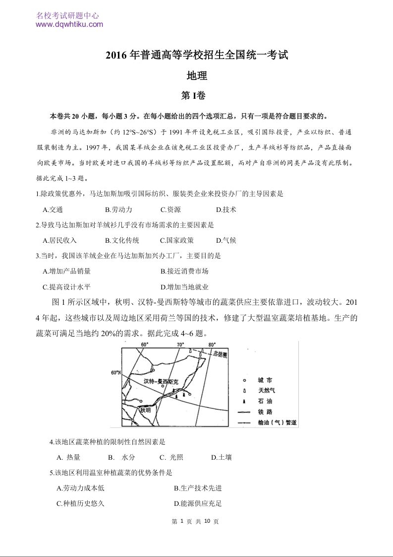 2016年地理高考真题--海南卷