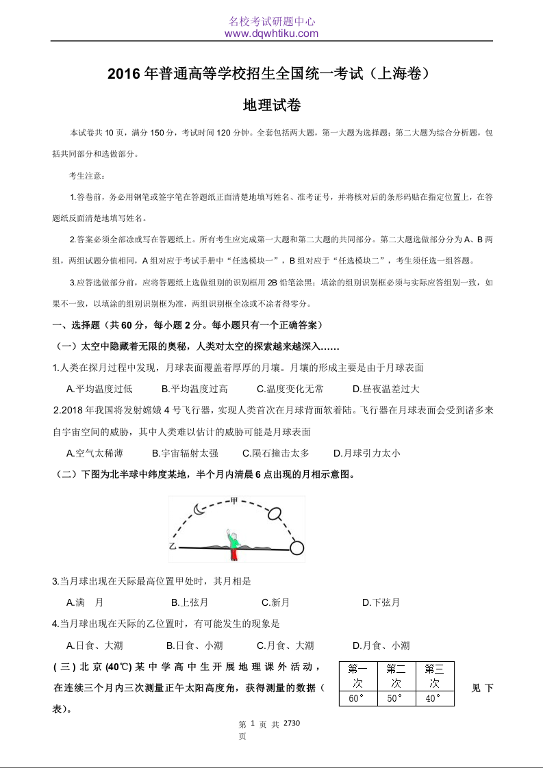 2016年地理高考真题--上海卷