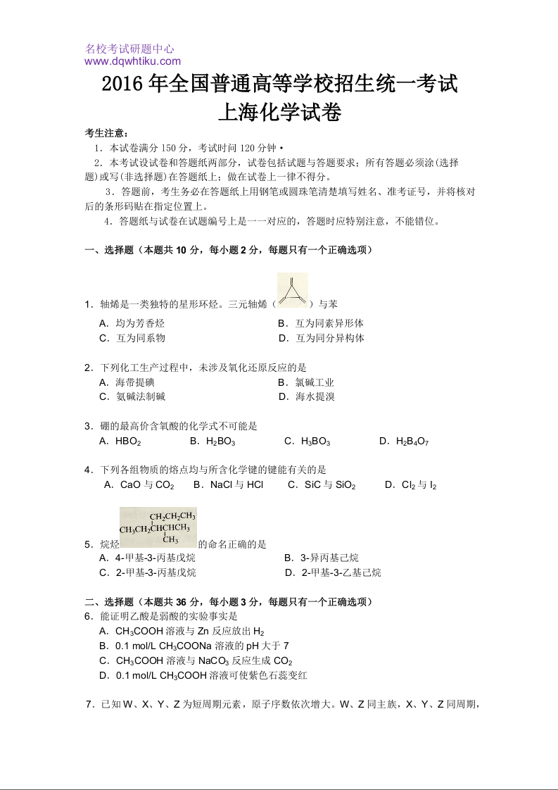 2016年上海市高中毕业统一学业考试化学试卷(word解析版)