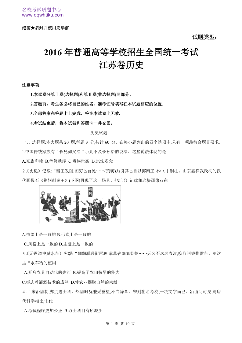 2016年历史高考真题--江苏卷