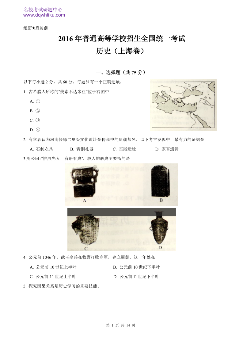 2016年历史高考真题--上海卷