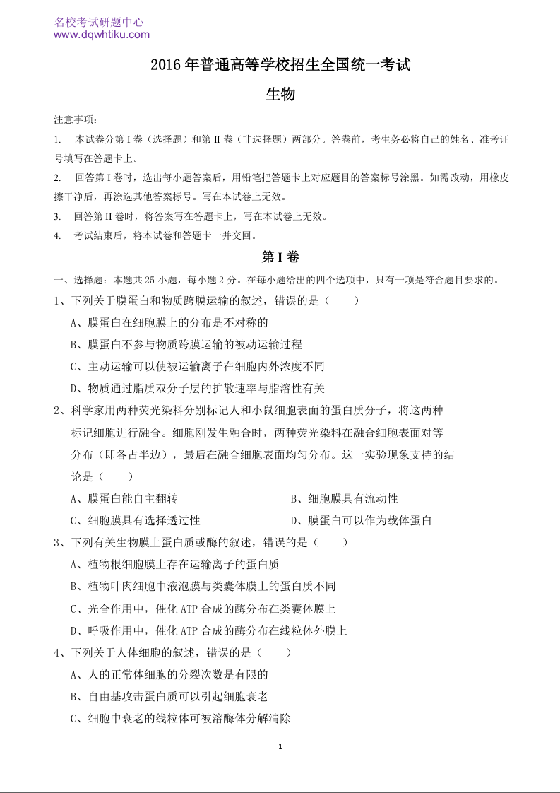 2016年高考生物真题(海南卷)