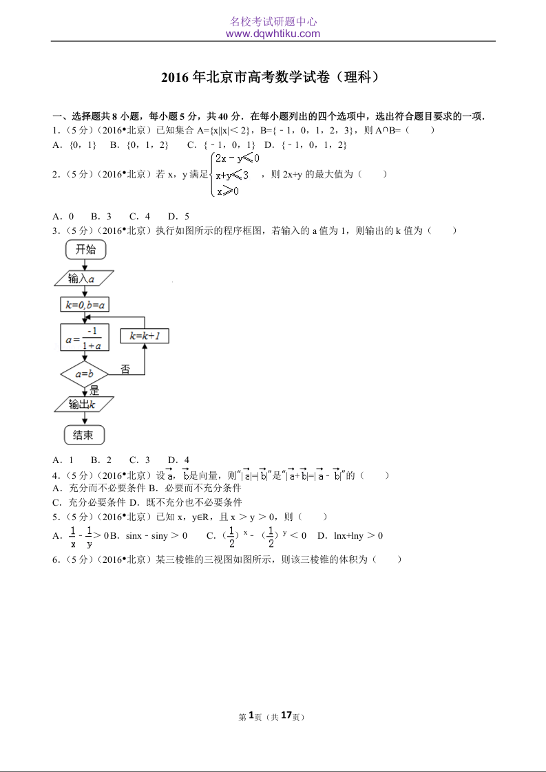 2016年北京高考理科数学试题及答案