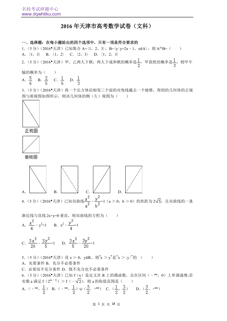 2016年天津高考文科数学试题及答案