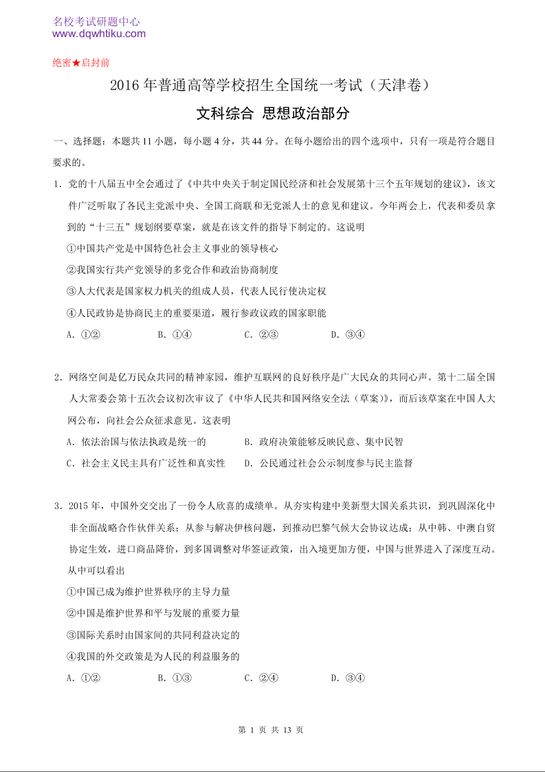 2016年政治高考真题--天津卷