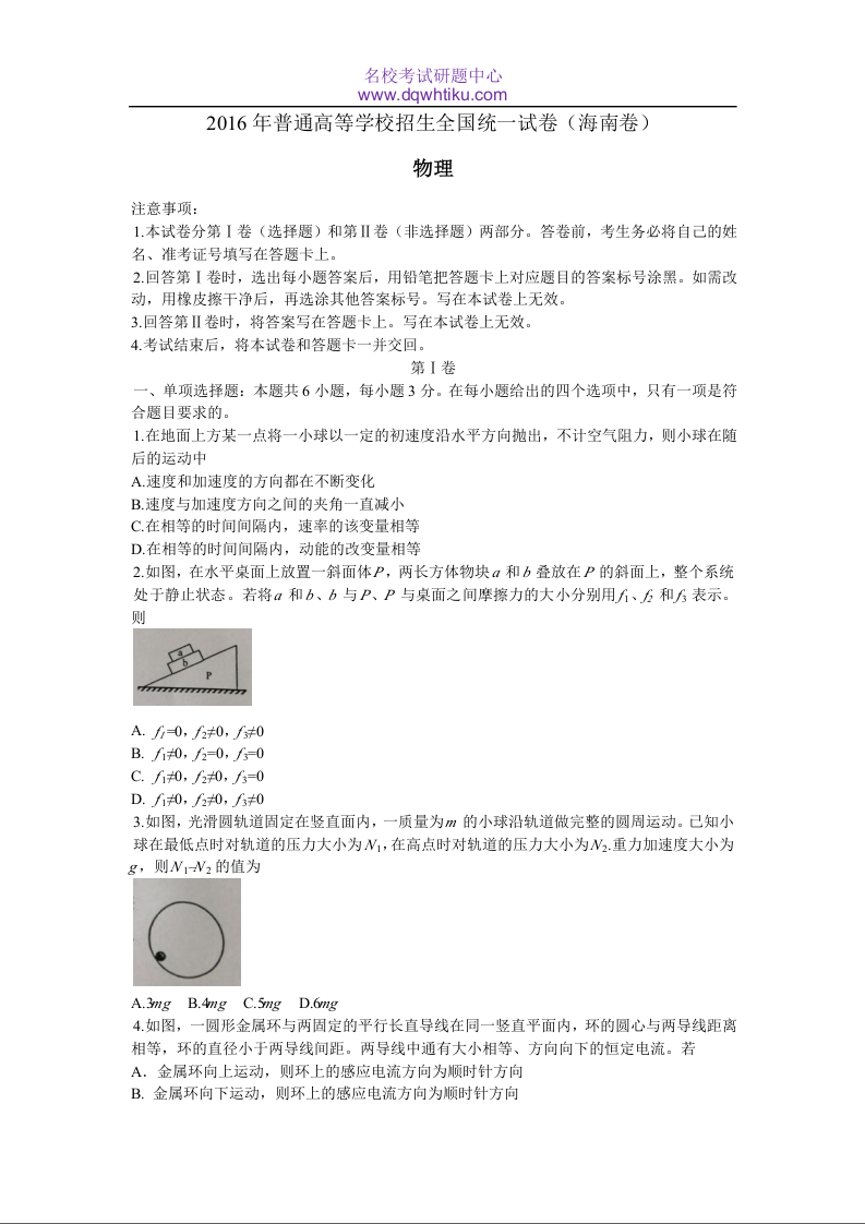 2016年海南高考物理试题及答案