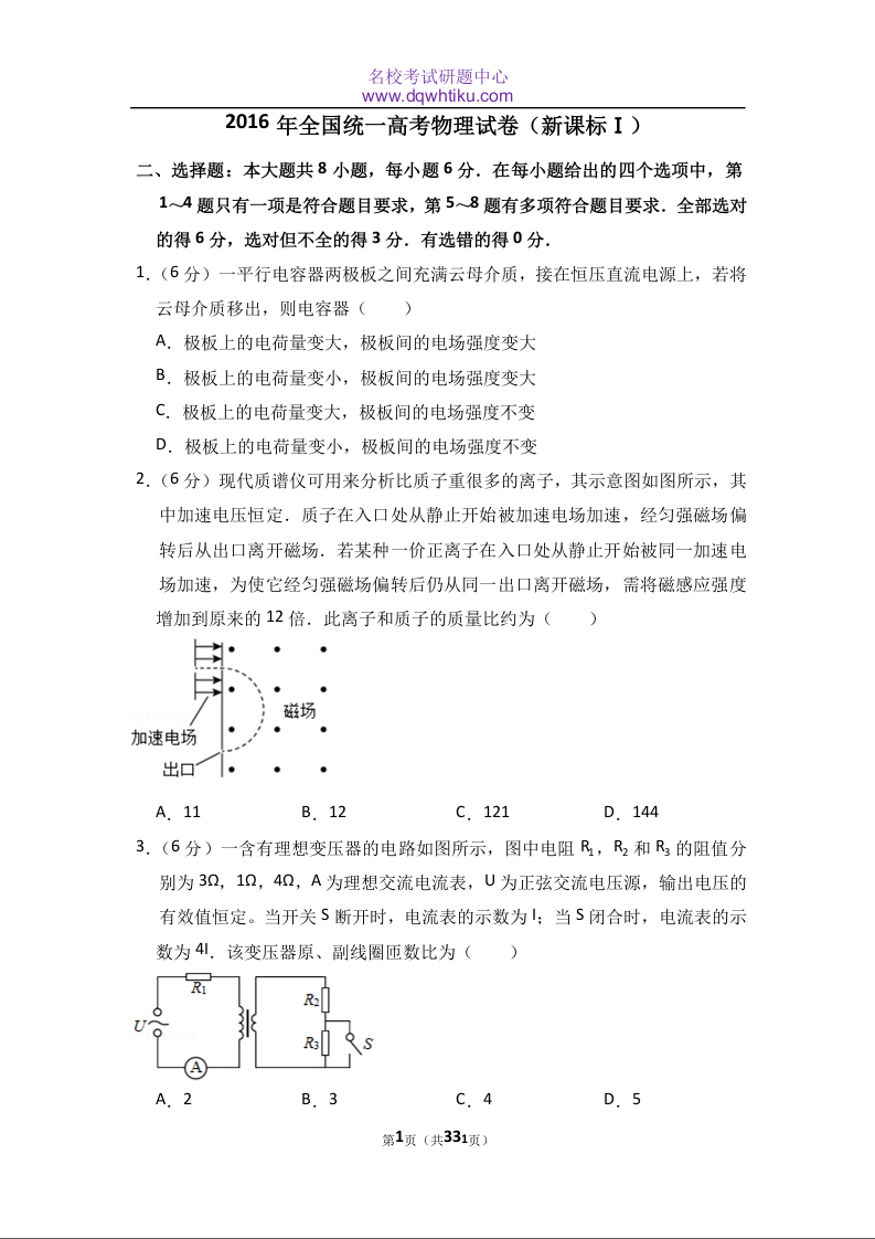 2016年全国统一高考物理试卷(新课标ⅰ)(含解析版)