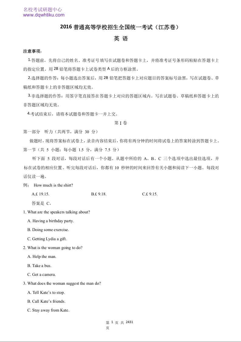 2016年高考英语(江苏卷)-Word版含答案