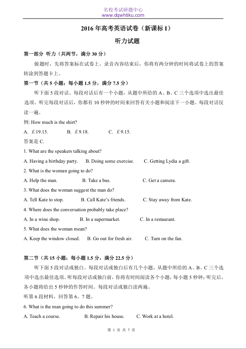 2016年高考英语试卷(新课标+i)答案