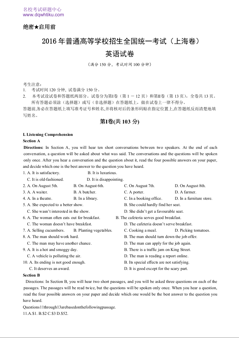 2016年上海高考英语真题试卷(word解析版,含听力原文)