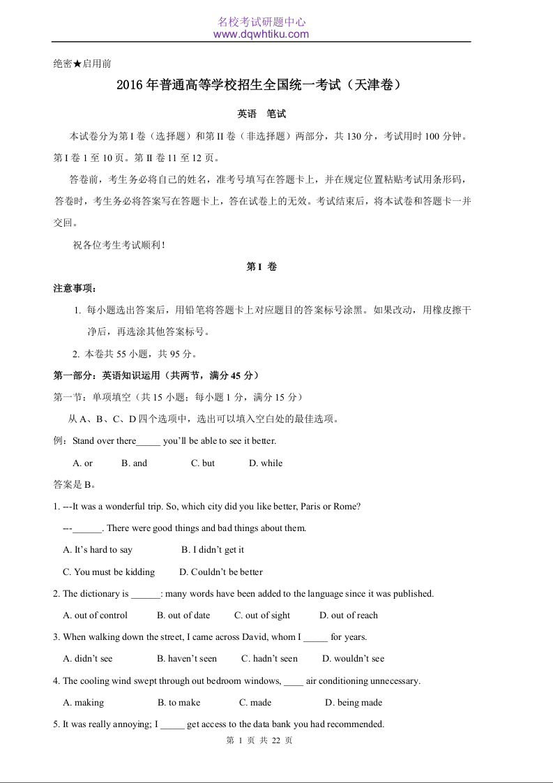 2016年天津高考英语试卷及答案