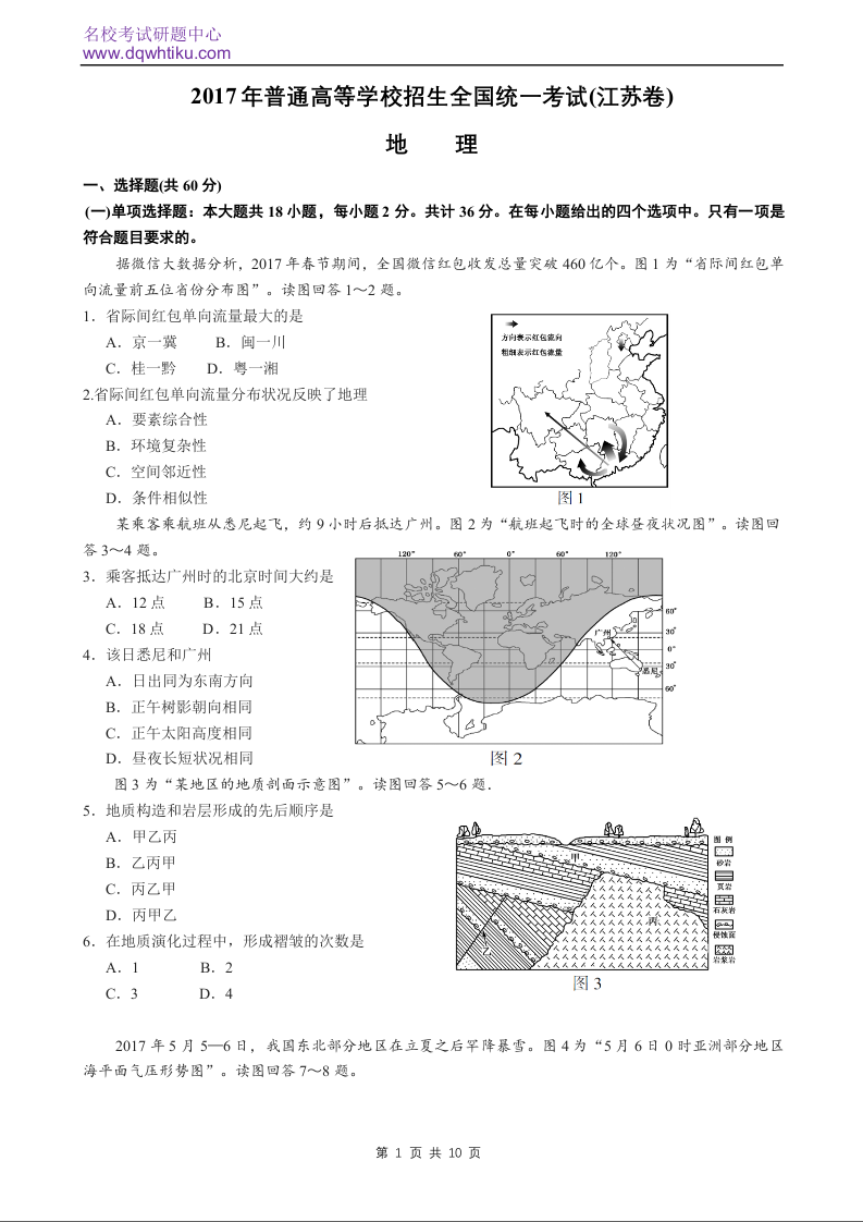 2017年地理高考真题--江苏卷