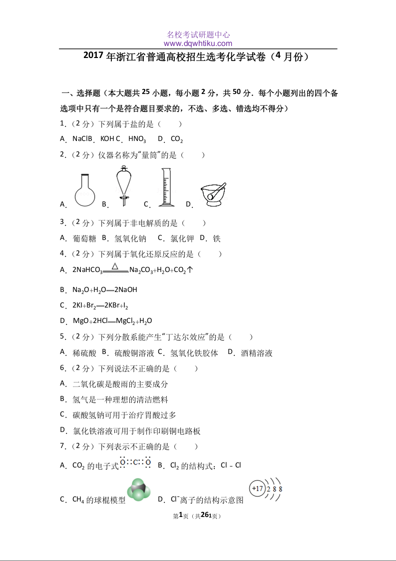 2017年4月浙江省高中化学学考选考试题与答案