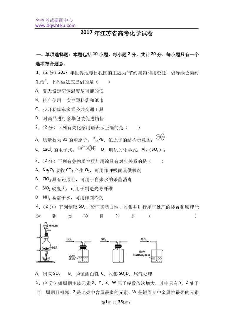 2017年江苏高考化学试题及答案