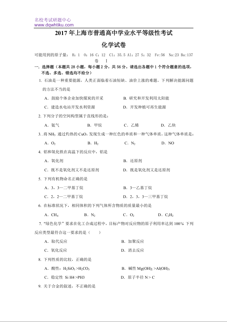 2017年上海市高中毕业统一学业考试化学试卷(word版)