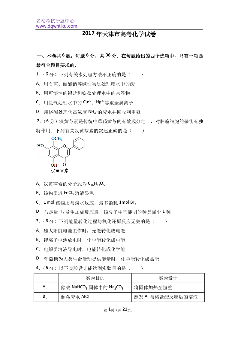 2017年天津高考理综化学试题含答案WORD