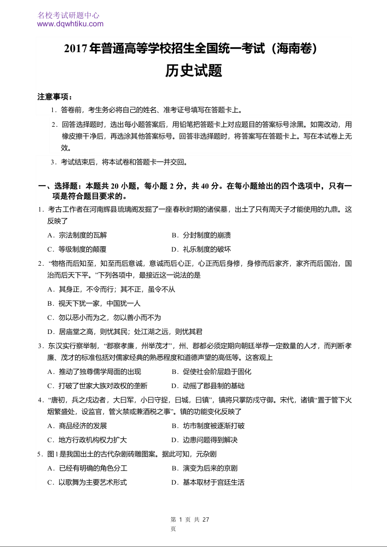 2017年历史高考真题--海南卷