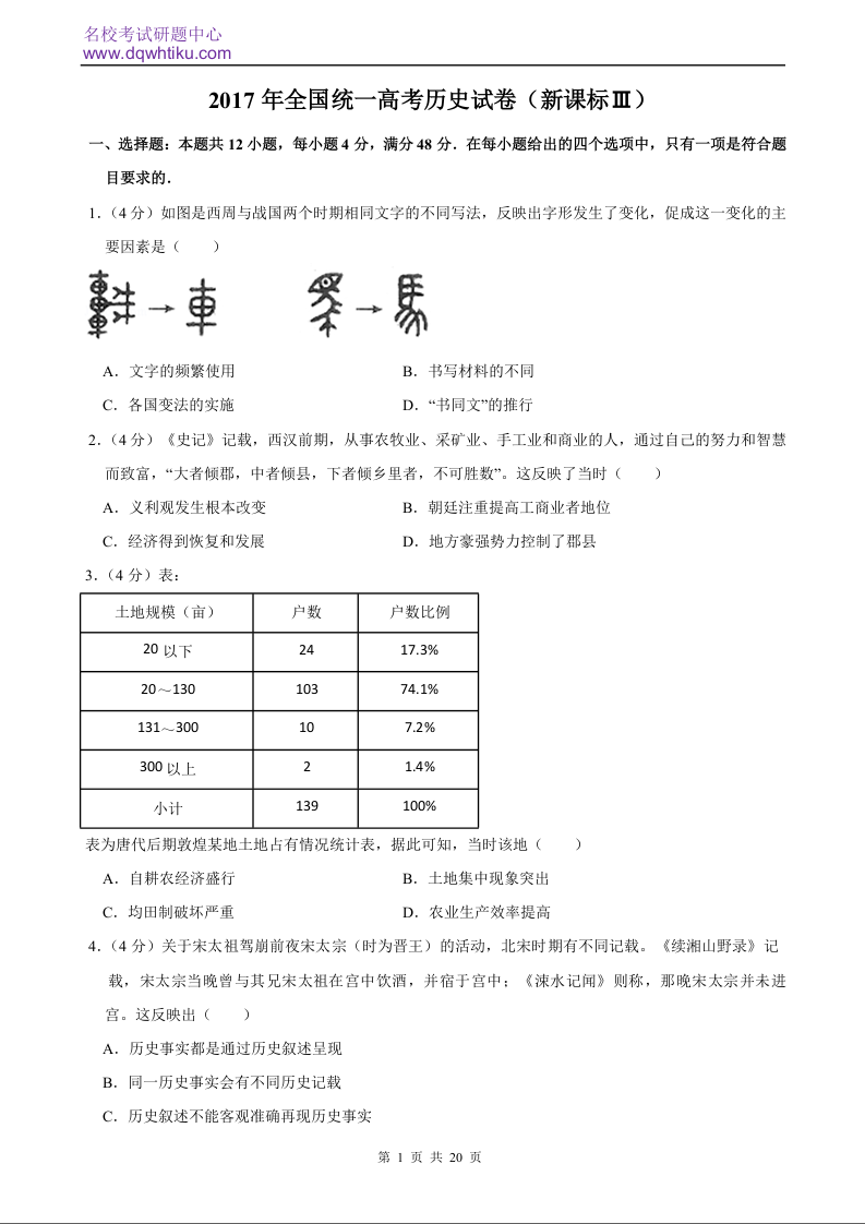 2017年历史高考真题--新课标Ⅲ卷