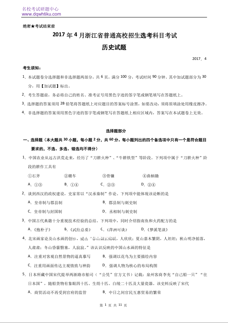 2017年历史高考真题--浙江4月选考