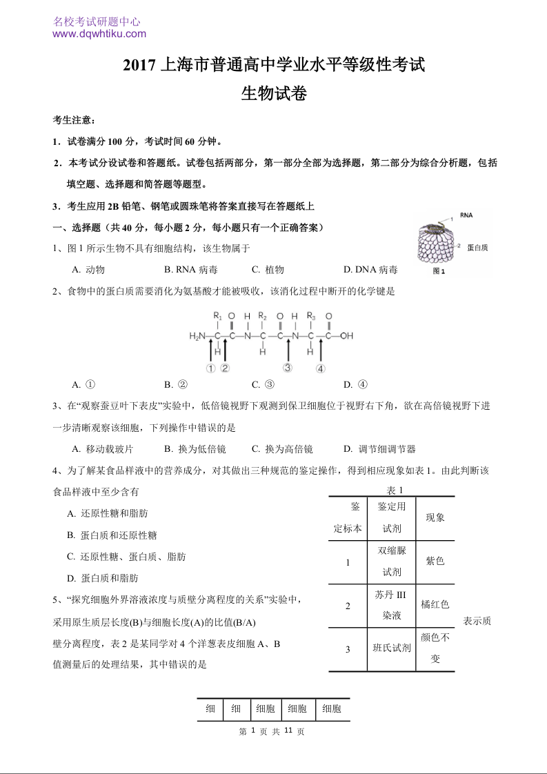 2017年高考生物真题(上海卷)